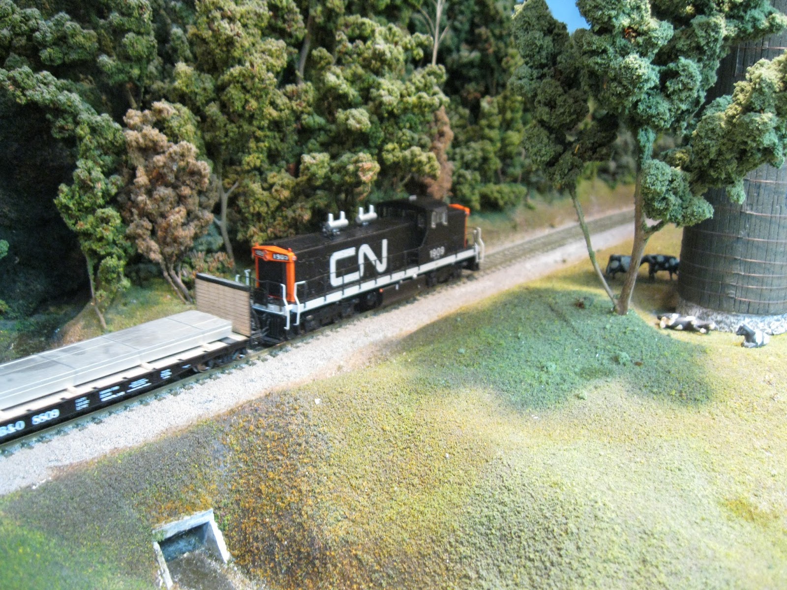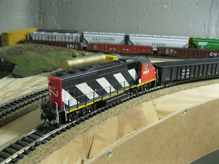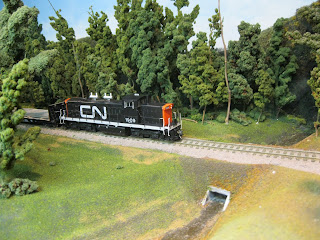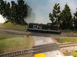 The crew will eventually have to run around their train to serve the other "facing" Hawkesbury industries in the newly scenicked area, but the large IVACO plant in L'Orignal has indicated that it is ready for their train. Joel deftly backs his train the 4 1/2 miles into the rolling mill.